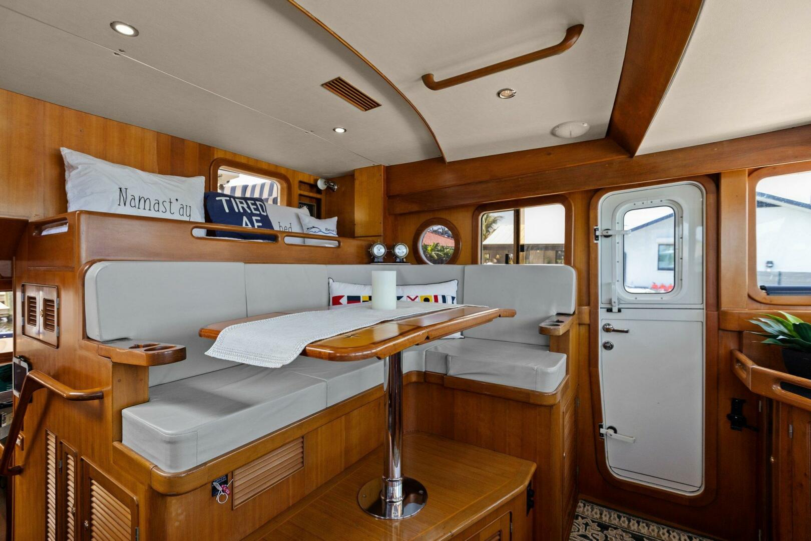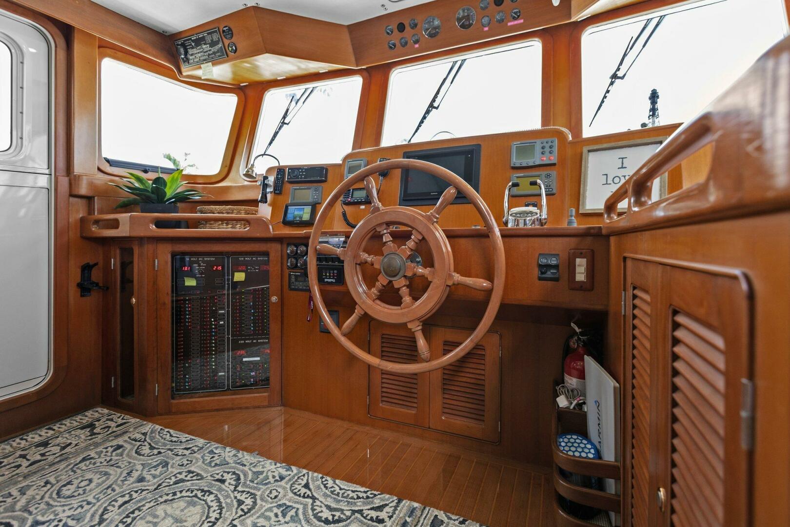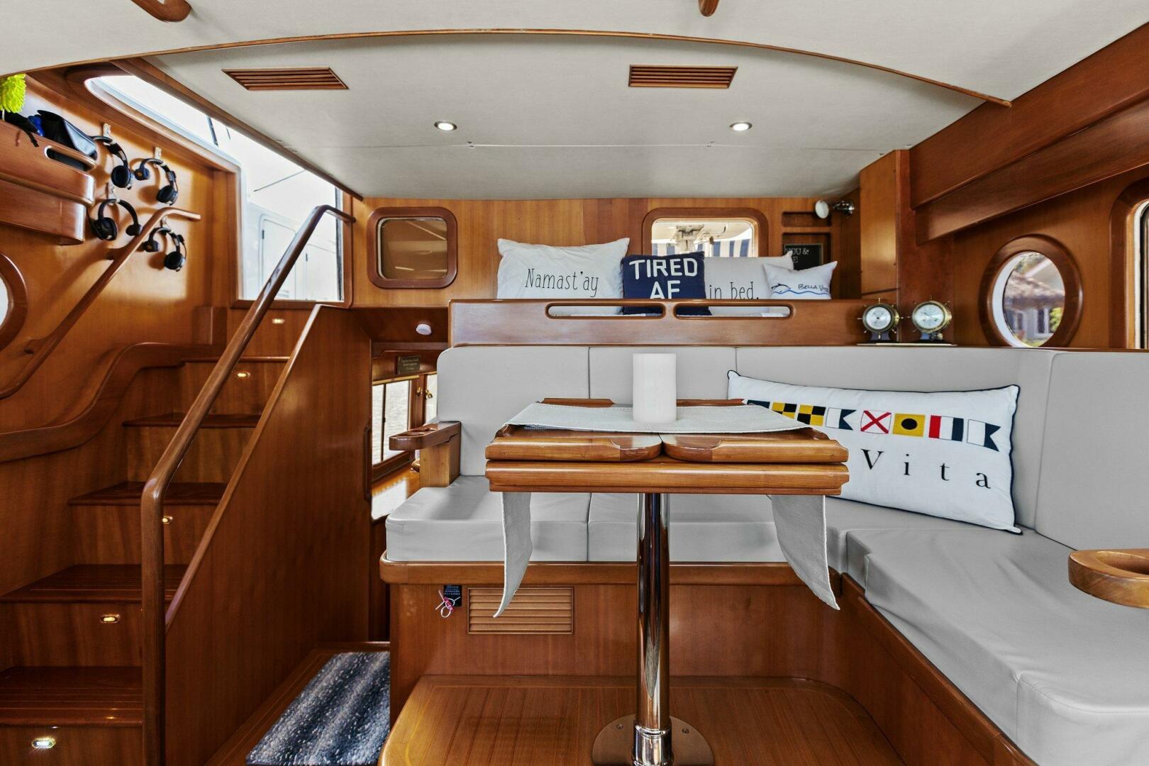 Moving starboard we head up the curved stairs that lead to the pilothouse. Now in the pilothouse, looking forward you have easy reach to all your navigation and systems monitoring. To port and starboard Dutch Doors (New 2020) which give access to both of the side decks. Behind you have a settee with a table and a watch berth behind it. Beautiful refinements and woodworking give it a touch of charm.