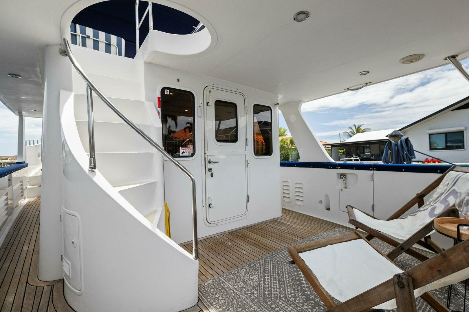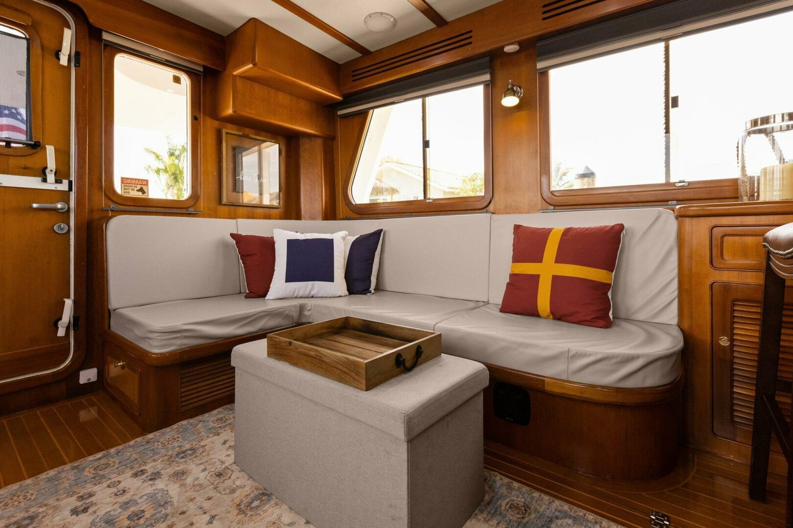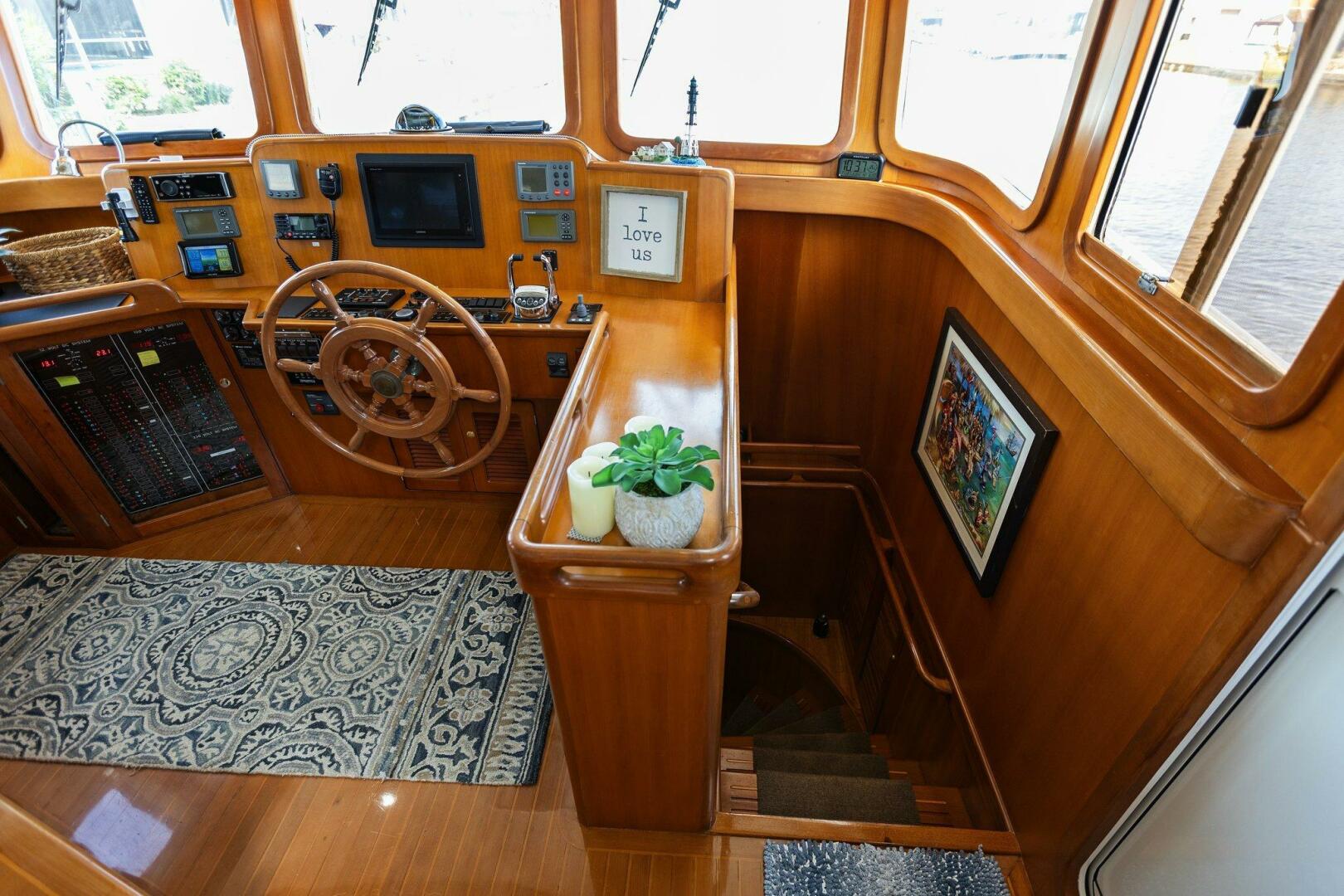 Moving starboard we head up the curved stairs that lead to the pilothouse. Now in the pilothouse, looking forward you have easy reach to all your navigation and systems monitoring. To port and starboard Dutch Doors (New 2020) which give access to both of the side decks. Behind you have a settee with a table and a watch berth behind it. Beautiful refinements and woodworking give it a touch of charm.