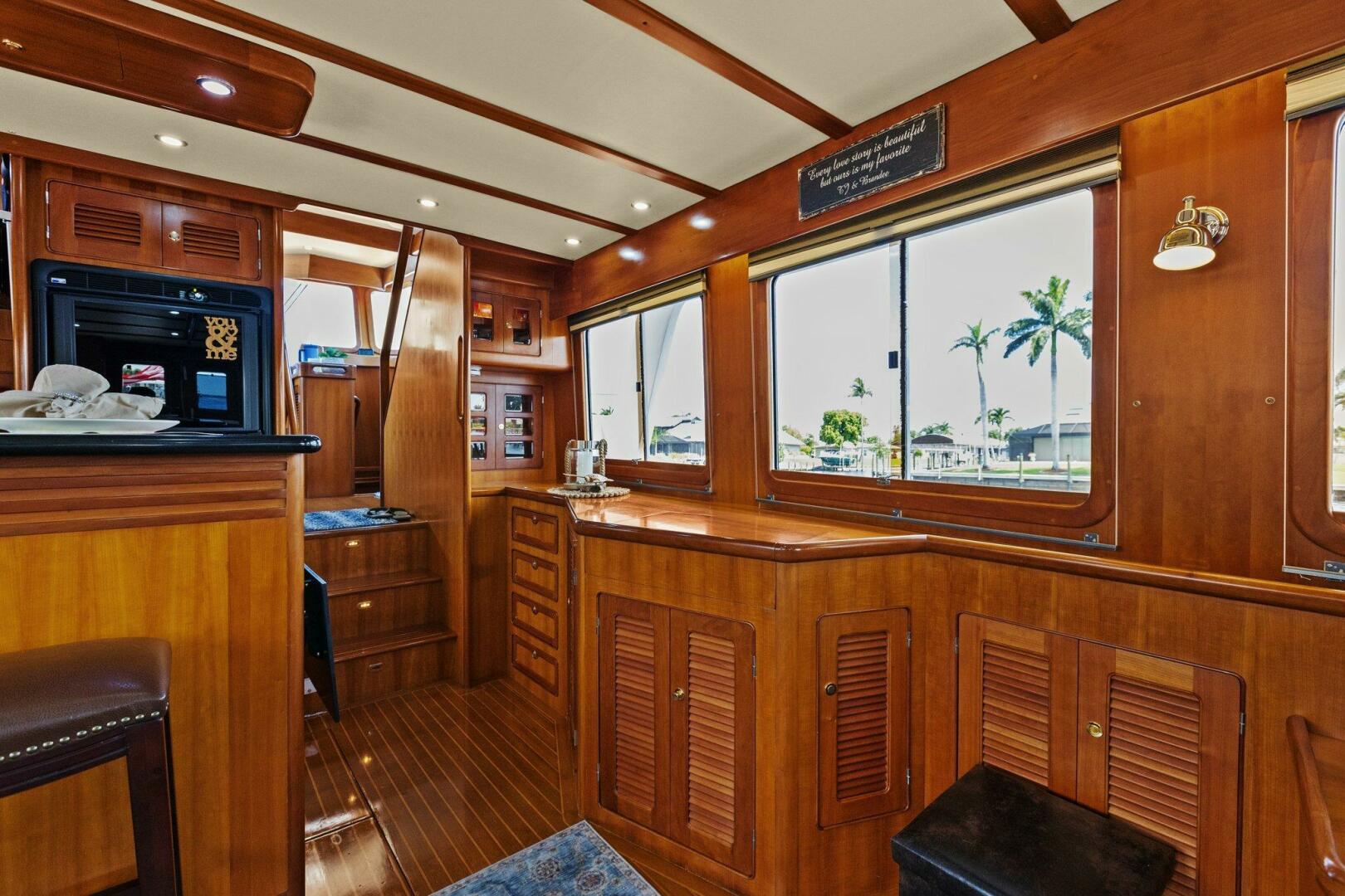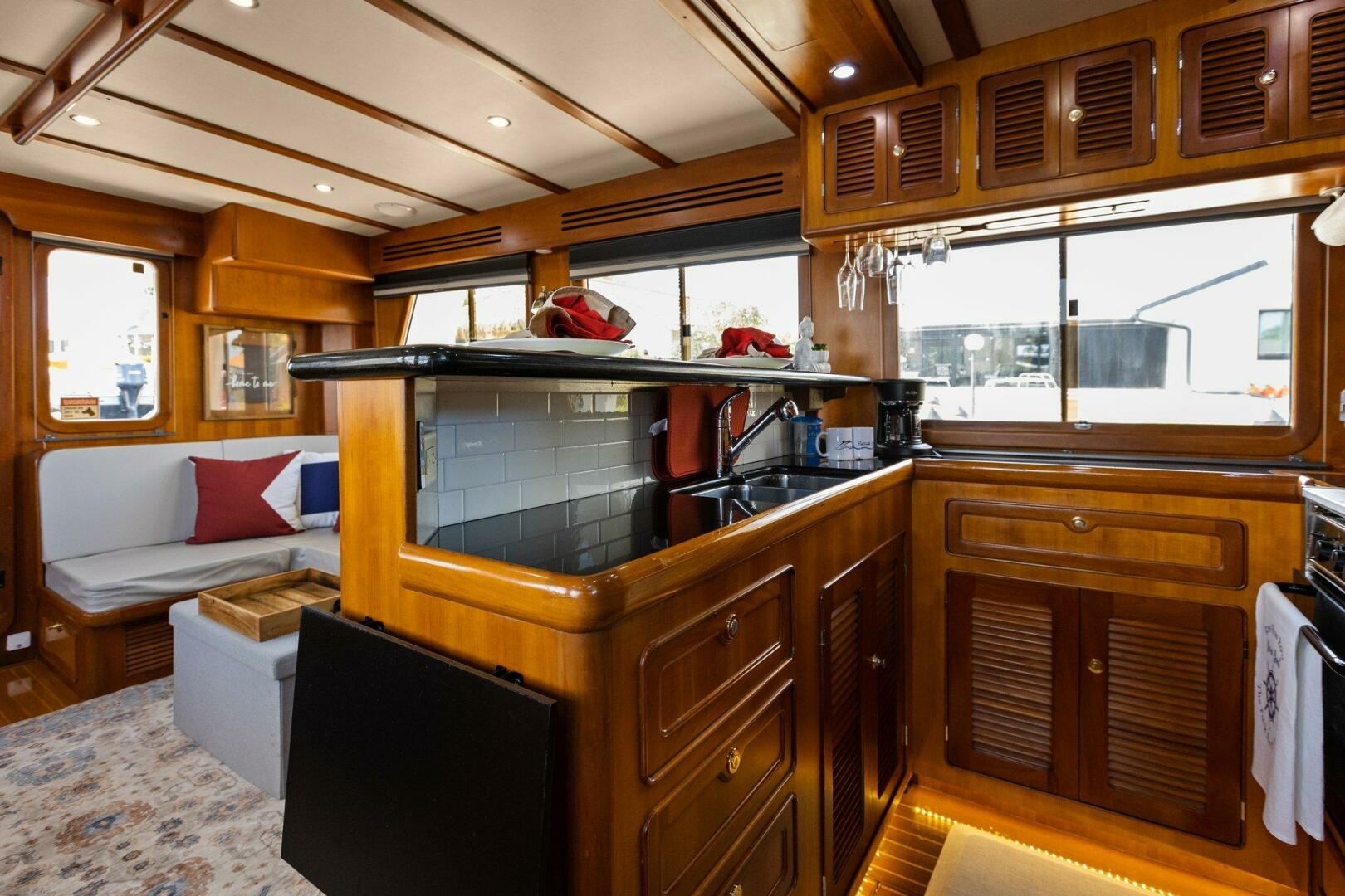 Leaving the pilothouse and continuing aft down two steps the galley is on the port side. From the fully equipped open galley you look back into the very nicely finished and appointed teak salon. Your entertainment is provided via a fold away flatscreen TV. To port is a built-in settee with storage. There is a large engine access door in the sole of the salon if needed.
