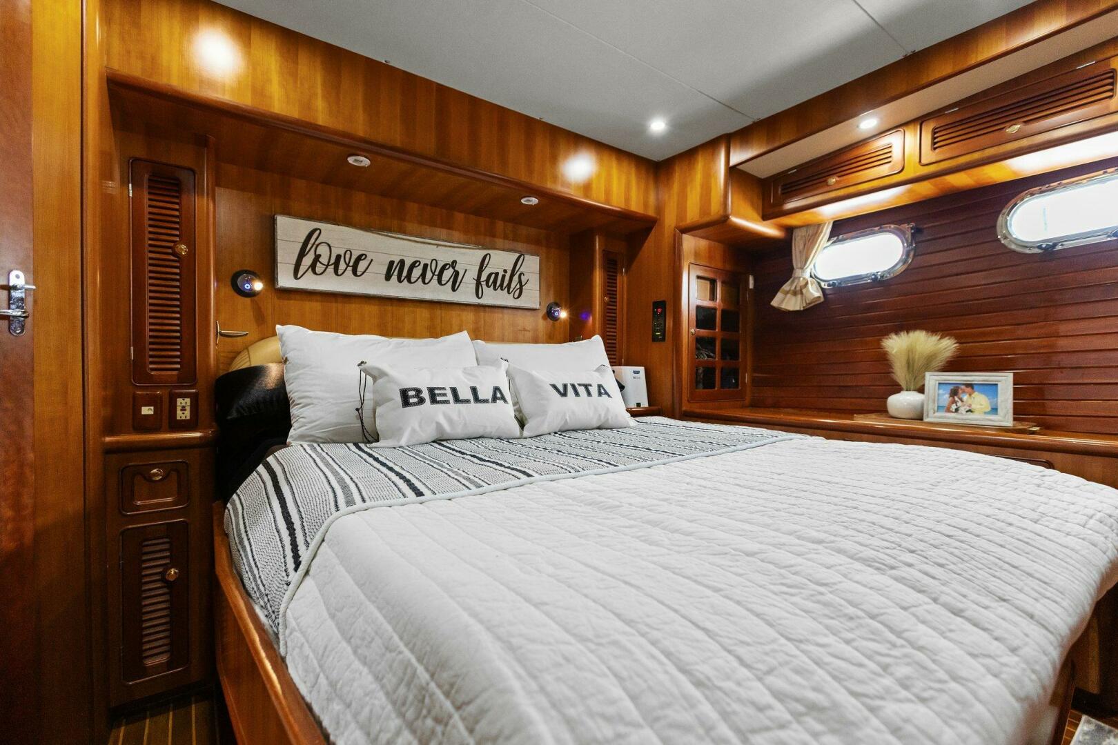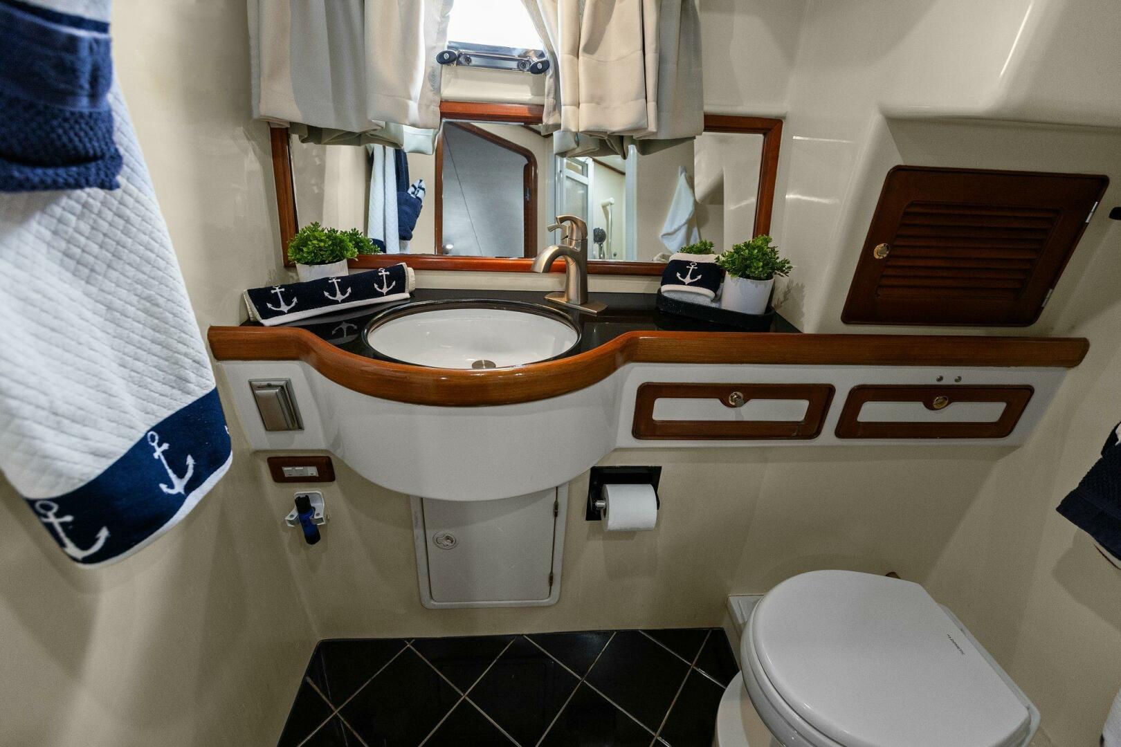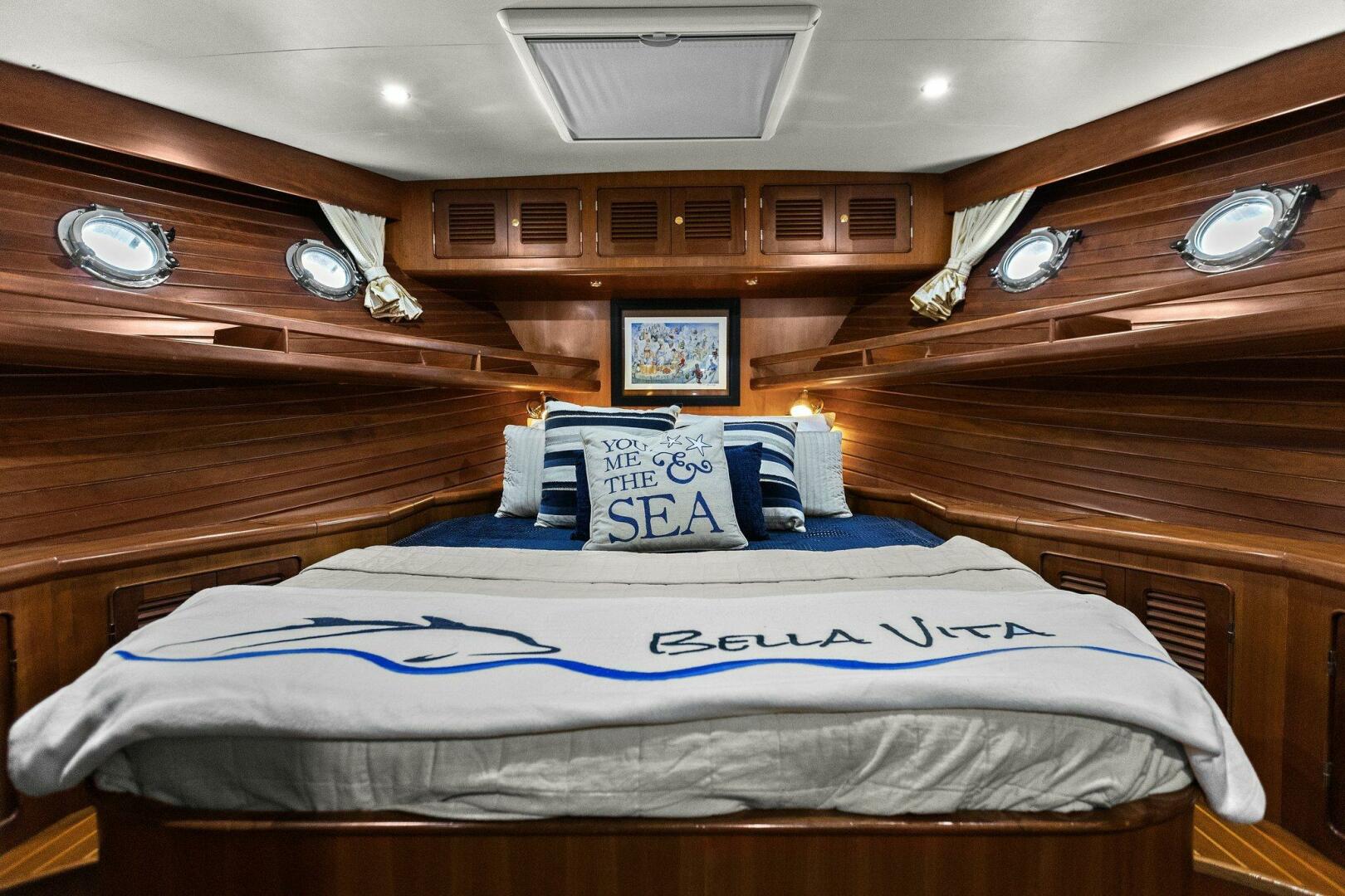 The ample guest stateroom is forward and offers a very comfortable centerline island queen berth. There is no lack of storage with two large drawers at the foot of the berth, cedar lined hanging lockers port and starboard and several other accessible spaces surrounding. There is a large flatscreen TV on the bulkhead wall to port. Natural light and ventilation abounds with four opening port lights and large hatch overhead. Just aft to starboard is the guest head. Two opening port lights illuminate and ventilate the vanity, sink, VacuFlush toilet and large stall shower.