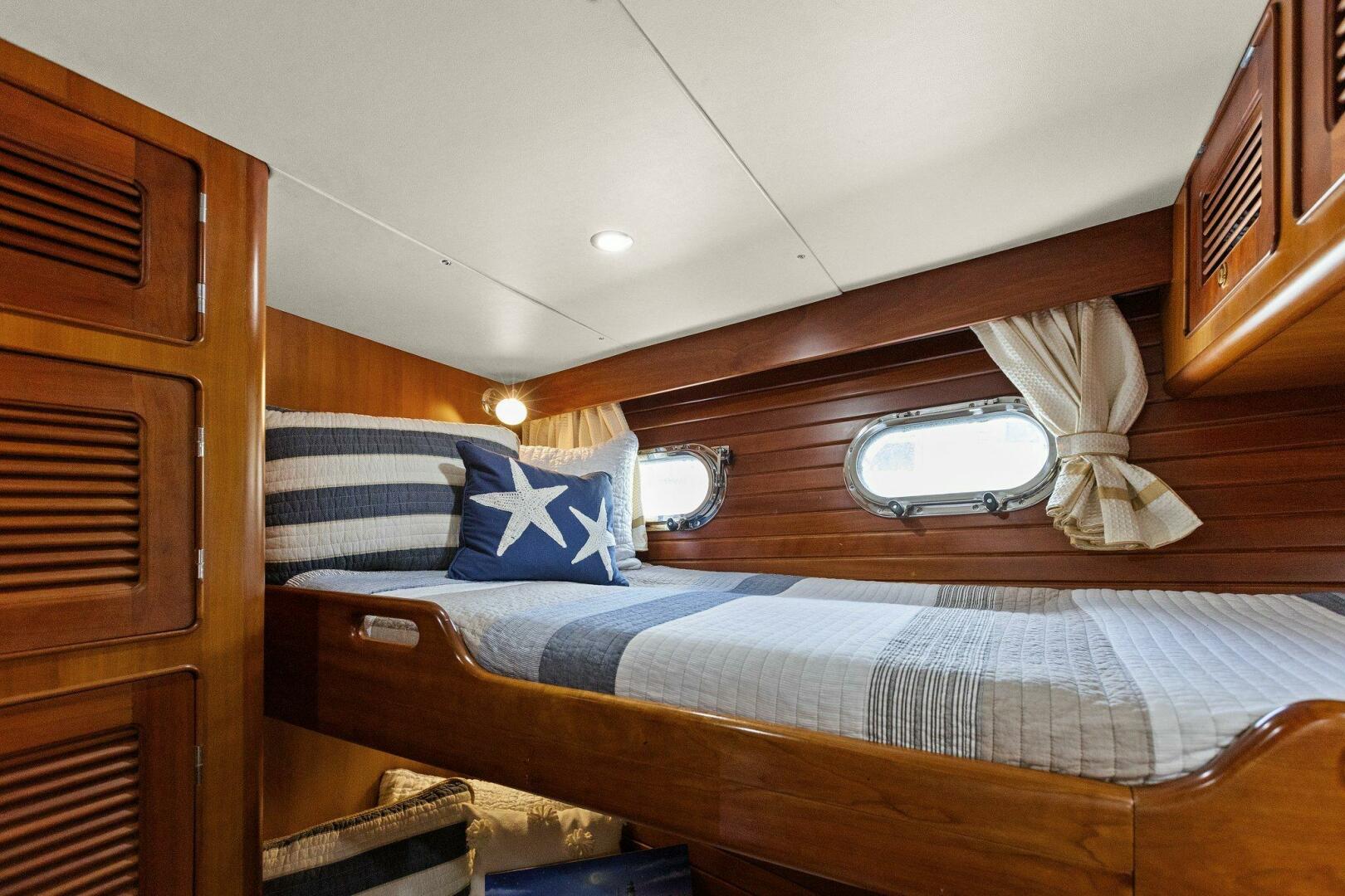 Continuing aft along the companionway you will note the well-lit steps back up to the pilothouse to your left. Just a few more steps and you are entering the amidships Master Stateroom. A centerline queen berth. With many drawers and cedar lined locker storage you will have ample options to store all your adventure wear including a custom installed safe and large flatscreen TV. An ample en-suite head is to starboard nicely laid out also with vanity, sink, VacuFlush toilet and a nice separate stall shower. A water tight door on the bulkhead of the stall shower leads to the engine room. Forward and to port is a nicely proportioned private office / third port stateroom with built in desk, lots of storage and two large bunk beds.